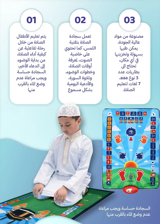 السجادة تحول لحظات التعلم إلى تجربة عملية. يقدم الصوت والإرشاد خطوة بخطوة تعليمًا واضحًا يساعد الطفل على حفظ الأوقات والحركات بسهولة ويجعل الوالدين أكثر هدوءًا واطمئنانًا.